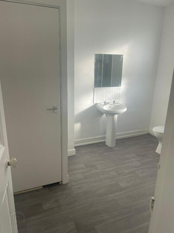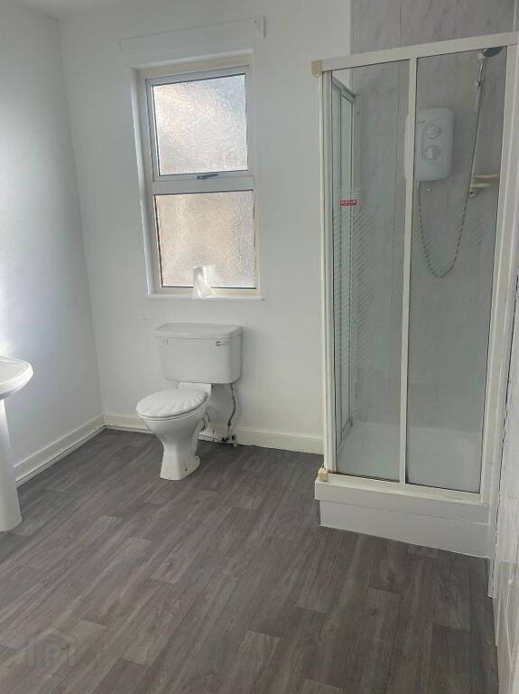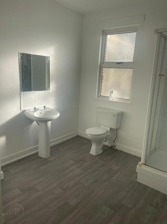 The bathroom comes with lino flooring, wash hand basin, toilet and standing shower with pleant of storage in the hot press.
